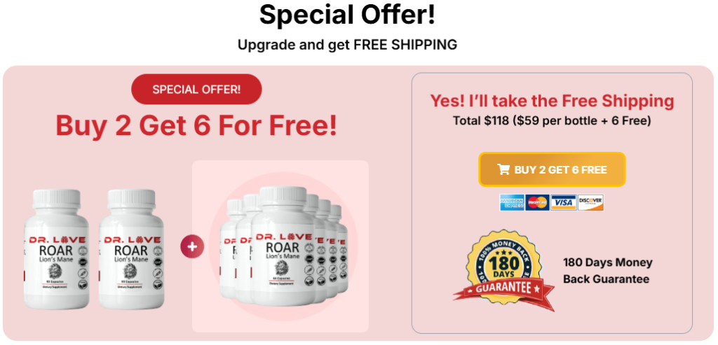 Each purchase is backed by a 180-day money-back guarantee, so you can try ROAR LION’S MANE risk-free.