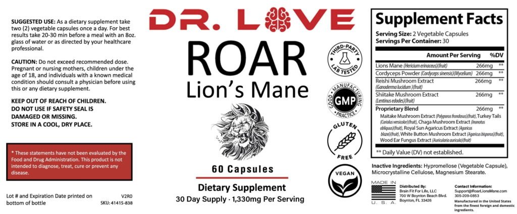 ROAR Lion’s Mane is a dietary supplement designed to support cognitive function, memory, focus, and overall brain health. It is made from natural ingredients, including the Lion’s Mane mushroom, known for its nootropic and neuroprotective properties.